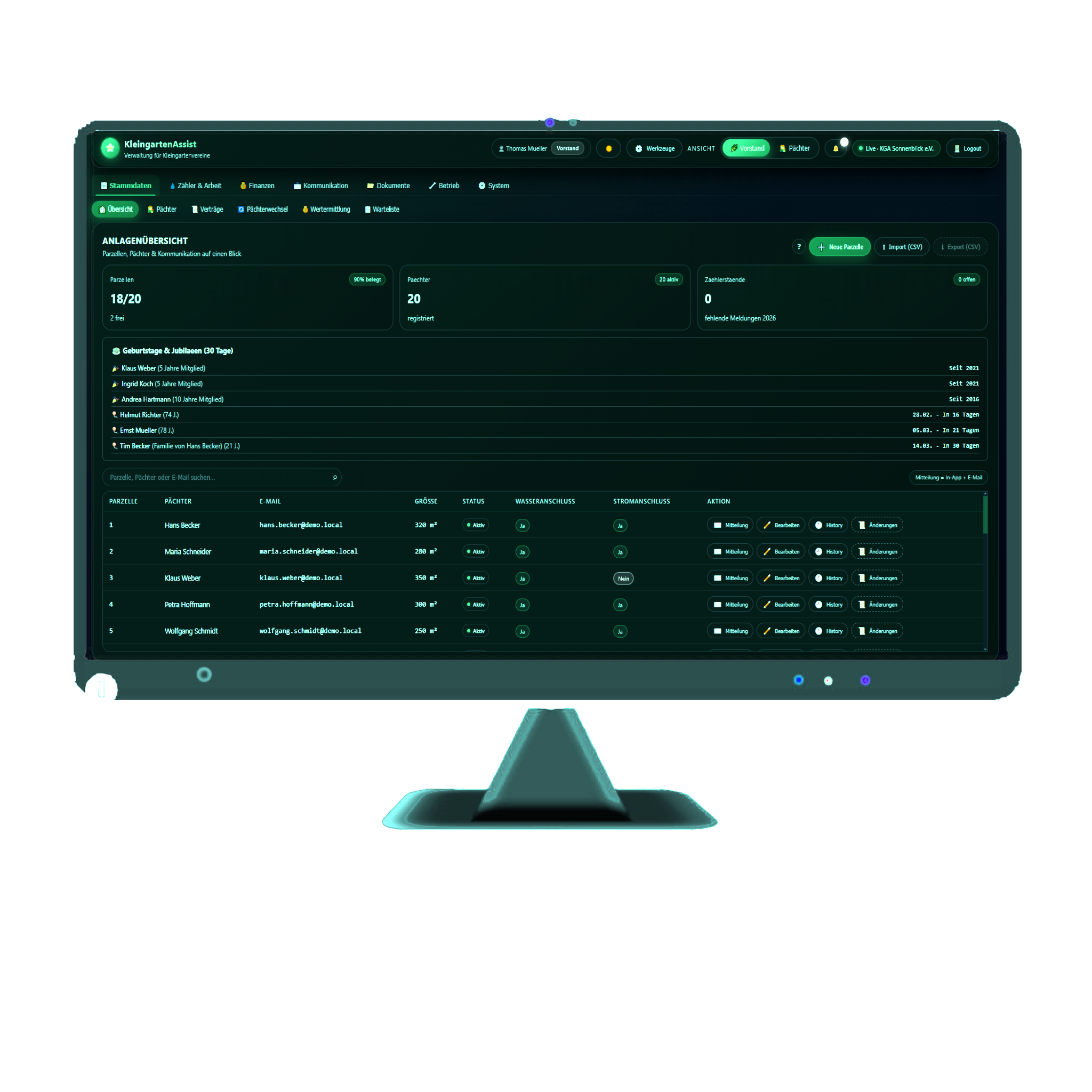 Parzellen, Pächter, Zählerstände, Arbeitsstunden und Kommunikation – alles in einer Oberfläche. Schluss mit Excel-Chaos und Zettelwirtschaft.